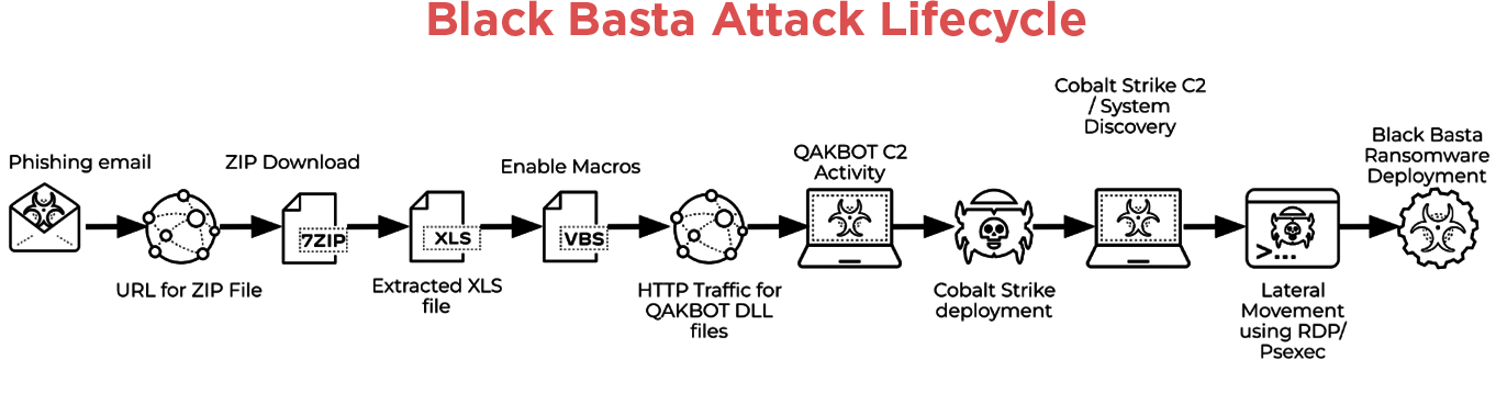 While Qakbot has been active since 2007, its modular design now enables it to act as a downloader for additional malware. The attack attempts to adapt to new tactics following Microsoft's default blocking of macros in web-downloaded documents. These attacks have been associated with the Black Basta Ransomware group, with overlapping techniques and infrastructure.